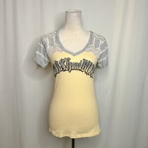 Yellow shirt with a thermal / waffle material. Gray upper half with see through lace decorated by clear sequins. Shaded logo with rhinestone. V neckline. New with tags.