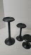 Three sizes- small, medium and large. Flat round Base, stem and round top with a slight lip to hold a Pillar candle and catch any drippings. Black in color. A ribbed fluted textured metal. Weighted with a velvety bottom. crate and barrel stickers on bottom.