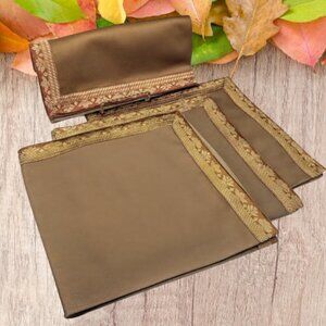Set of four (4) square cotton blend "A Cappella Gold" napkins with metallic border from Crate & Barrel.