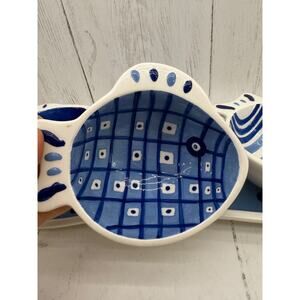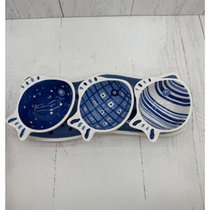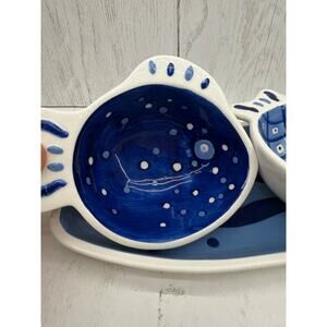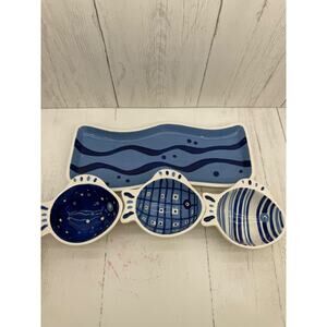 Crate & Barrel Blue Fish 4 piece Condiment Set Tray Server Cups RARE