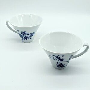 Pair of two (2) Camille blue and white floral porcelain flat cups from Crate & Barrel.