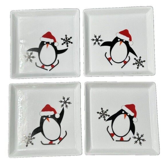 Crate & Barrel Christmas Penguin Porcelain Appetizer Plates Set of 4 New in Box