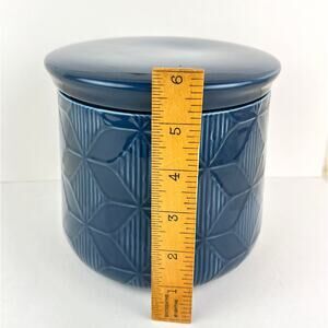 Blue geometric patterned canister stands 6" tall and 6" wide. Perfect for your tea or dog treats. Lid has a rubber seal to keep your items fresh.
