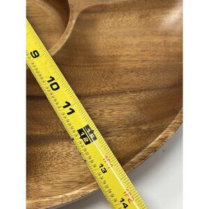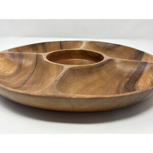 This beautiful Crate and Barrel Tondo Acacia Wood 5 Part Server is the perfect addition to any dinnerware and serveware collection. The server is made in the Philippines and features a round shape with a medium brown wood tone and wood grain pattern. It has five compartments, with a diameter of 13.5 inches and a depth of 1.5 inches, making it a great choice for serving snacks, appetizers, or desserts. The wood server is easy to fill and features a simple yet elegant design that will complement any kitchen or dining room decor. It is made of high-quality wood. This 5 part server is an excellent choice for entertaining guests at your next party or event.