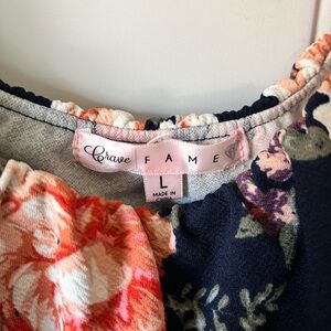 Embrace sophistication with this Crave Fame dress, showcasing a captivating blue and pink design. Gently used, no stains, no flaws. The asymmetrical off-the-shoulder neckline is enhanced by a ruffled overlay, forming elegant flutter sleeves. Ideal for wedding guests or cocktail occasions, this bodycon dress exudes a romantic charm.