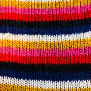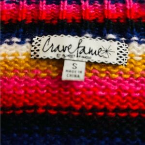 Embrace a bold look with the Crave Fame sweater, featuring a striking combination of red pink and yellow stripes. This crew neck design offers a textured, ribbed appearance, perfect for making a statement in any setting. The vibrant colors and classic neckline ensure a stylish and comfortable fit.