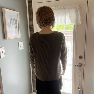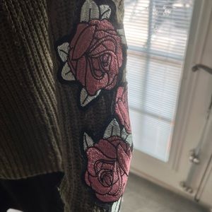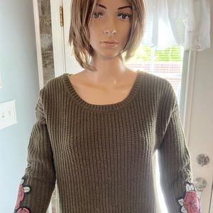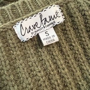 Crave Fame Sweater SZ SM. Measures 23” in length from shoulder to bottom of hem. Bust measures 20” from armpit to armpit laying flat. 100% Acrylic. Army Green in Color. Both Sleeves feature Appliqué of Roses.