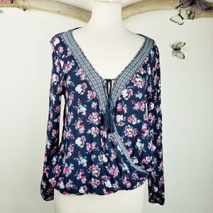 Surplice front boho long sleeve floral navy with multi colored pink flowers and a contrasting trim. Ties closed with navy tassels. Long sleeves summer multi season blouse top