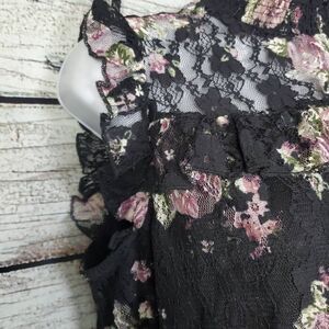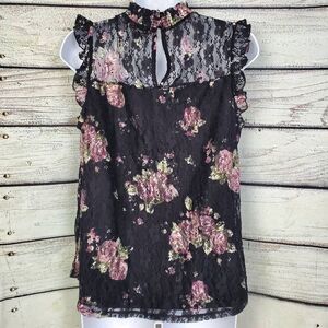 Romantic Crave Fame by Almost Famous women’s sleeveless blouse in size Large, featuring black sheer floral lace overlay with pink rose print and ruffle accents. Lightweight and lined for comfort, with a mock neck and keyhole back closure.