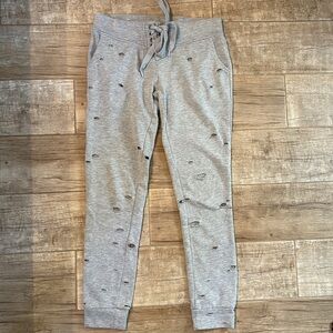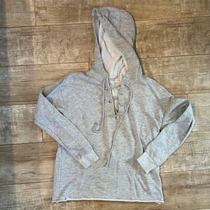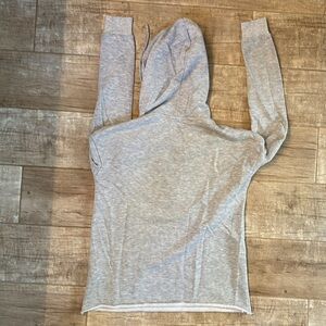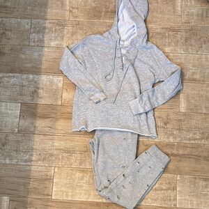 Item: Cozy gray hooded lounge set with distressed details. Perfect for casual wear.