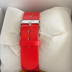 This is a cute fun red Crayo watch with red leather band. The face is also red with white hands and date panel. Never worn. Needs a new battery.
