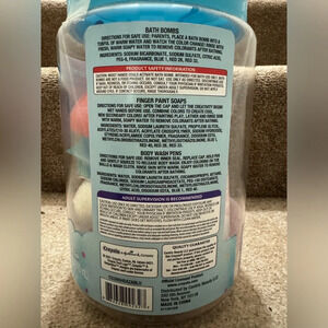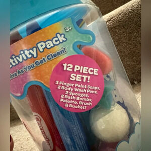 Included finger paints soaps, bath bombs, sponges, body wash pens, palette, brush and a bucket.