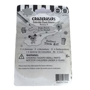 Erasers are not just for erasing? Are you crazy? Hop on the latest fashion/toy trend, collect these cute CRAZERASERS! Series 2 of the CRAZERASERS bring us even more surprisingly new erasers! No PVC. Safety Tested. Each pack contains 4 mini-erasers.
