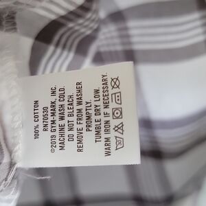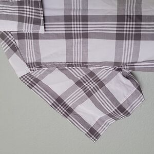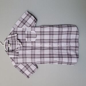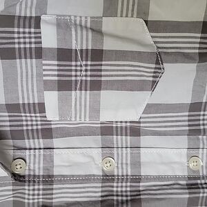 Short sleeves. Gray and white plaid color combo. Lightweight fabric. 100% cotton. Excellent condition. Great for layering, very versatile. Wear another short sleeve under and wear it unbuttoned, or wear a long sleeve under it or no shirt and buttoned up.