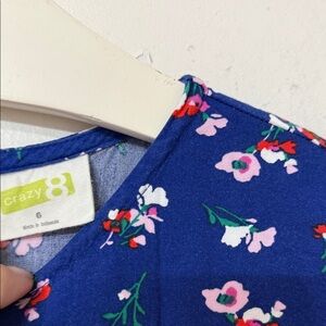 Navy dress with vibrant floral pattern. Features playful ruffle accents.