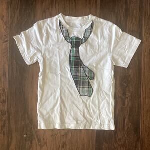 White short sleeve t-shirt by Crazy 8 in very good preowned condition. The composition and size information on the tee is really worn and hard to read. No other flaws. Still bright white. Features fun tie applique.