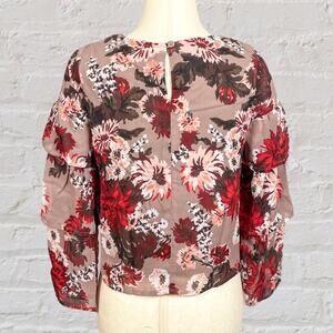 π Adorable Y2K Crazy 8 blouse with tiered ruffle sleeves + floral cottagecore pattern in burgundy, taupe & forest green.