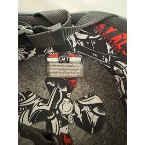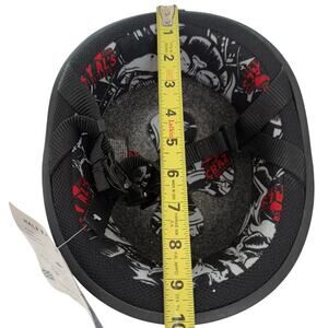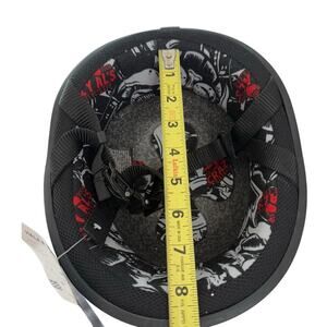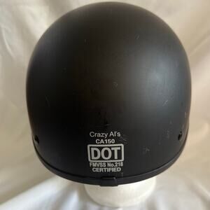 New with tags SOA style Crazy Al's DOT FMVSS No. 218 Certified half face helmet in matte black. EPS liner, adjustable chin strap, quilted interior. Size Medium. Please zoom photos: I have included measurements for the inside and outside diameters. The circumference, measured along the outside of the base is approximately 30 inches. Unpackaged weight is approximately 1 lb, 2 ounces.