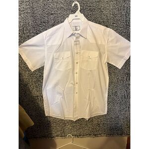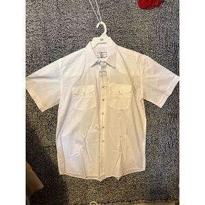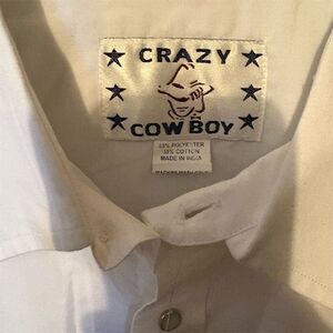 Keywords: Crazy Cowboy, button-up shirt, 2XL, short sleeve, white, men's casual shirt, polyester cotton blend, pearl snaps, chest pockets, collared shirt, solid pattern, embroidered accents, regular fit, casual occasions, new condition.