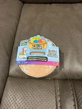 Rainbow Mystery Dumpling toy in tan color. Collectible surprise playset with mystery dumplings for imaginative play. Includes chance to find a special golden glitter dumpling. Great for gifting and playtime.