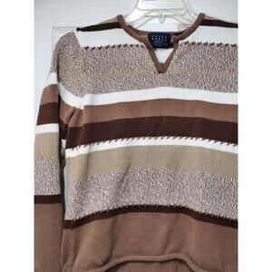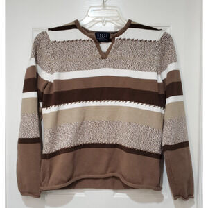 Crazy Horse by Liz Claiborne Women’s Petite MD Sweater Brown Beige Striped V-Nec