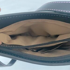Such a fun and colorful purse! Faux leather. Black with multicolored fleur-de-lis. Pink stitching. Multiple compartments. The side sections are just 1 big pocket. The center compartment has multiple pockets, including one that has a zipper closure. The center compartment also closes with a zipper. Nylon lining. Side pocket with zipper. Great for when you need a pop of color. Perfect for a trip to New Orleans! Matching wristlet and key chain sold separately.