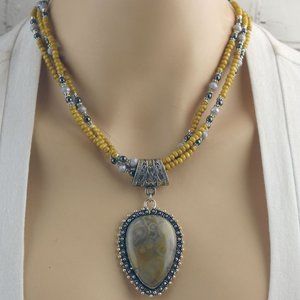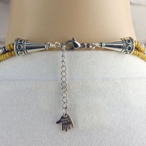 This necklace has three (3) strands of caramel color seed beads with gray glass and hematite placed randomly throughout. It has a stainless-steel closure that includes the lobster claw clasp, extension chain and jump rings.