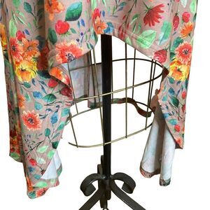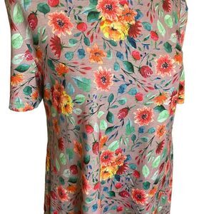 An adorable and fun Crazy Train top. High/Low. Rayon and Spandex. Short Sleeve. Floral print in orange, yellow, red, green. Base color is is beige/taupe. NWOT