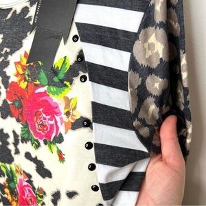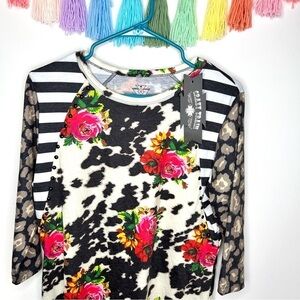 Title: Crazy Train Western Cow Floral Leopard Print Studded 3/4 Sleeve Top Size Small