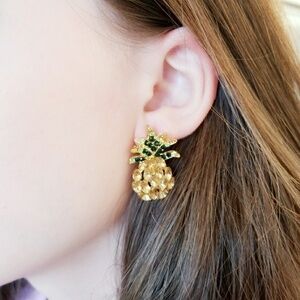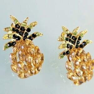 Pineapples are one of the hottest trends this season and these earrings are just too much fun! Multicolor rhinestones on a gold tone metal and stud style. If you're going on vacation or headed to the beach don't forget your pineapple earrings!