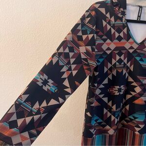 Crazy Train Hoodie. Size Medium. Aztec/Southwest Pattern. Black Brown Turquoise Coloring. Very soft fabric. Length from shoulder to bottom is 29”. Armpit to armpit is 22”. 53% cotton 42% polyester 5% spandex.