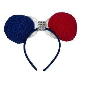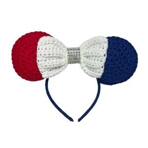 Stylish crochet bow headband. Features red, white, and blue colors. Perfect for adding a pop of color.