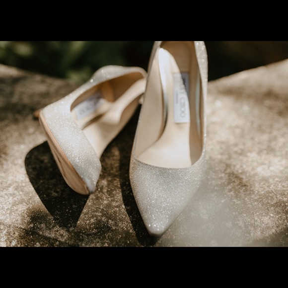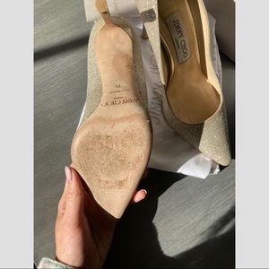 Jimmy Choo Romy 100 heels. Wore this once for 4 hours for my wedding. In good condition. Flaws are pictured. Very comfortable. These heels made me feel like the most beautiful bride on my wedding day! Comes with duster bag and box. Retail price $695 + tax. Make me an offer!
