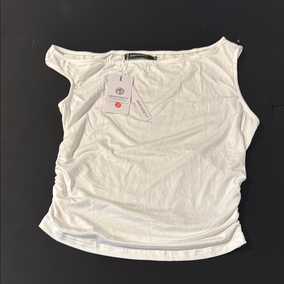 This cream tank top features an elegant asymmetrical design with ruched detailing for a stylish touch. The sleeveless cut and soft fabric offer comfort and versatility for everyday wear. Its rounded neckline and cropped length add a modern flair to any outfit.