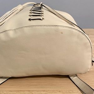 Cream colored backpack with tassels purchased from Forever 21. Has a magnetic clasp and drawstrings to keep belongings in place. Straps are adjustable. Great condition; used roughly 5 times.