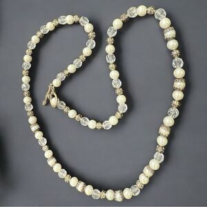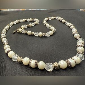 Pretty and versatile necklace featuring creamy faux pearls, faceted clear beads, and antique-style metal spacers. The toggle clasp adds a vintage flair to this lightweight, wearable piece.