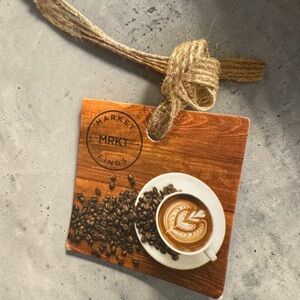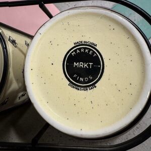 Set of four cream ceramic mugs featuring a repeat black bee motif. Includes a black metal rack for neat, space-saving storage. Durable glazed finish with a speckled look for casual, everyday use. Perfect for gifting or organizing your coffee and tea mugs.