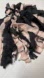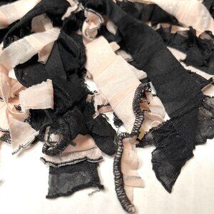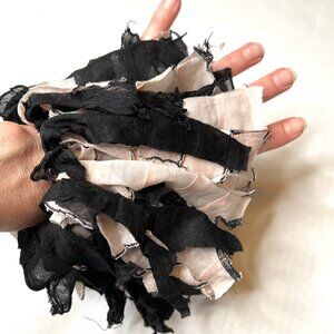 Fluffy cream and black ruffle fringe hair tie. Made from recycled materials. The ruffle fringe is knotted around a regular hair tie or elastic. Can also be worn as an arm cuff/bracelet. I also make these in more colors, as well as matching gloves, leg warmers, and earrings!