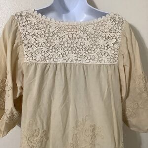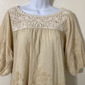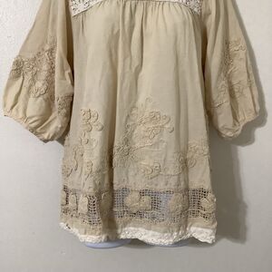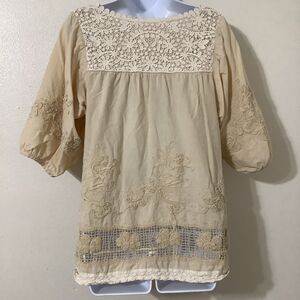 Cream Bohemian Lagenlook Cottagecore Coastal Cowgirl Crochet Festival Blouse L