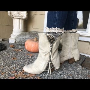 Cream Booties with some bronze sequins perfect for Fall and winter! Practically new, worn less than a handful of times. Still have the box. Fits true to size.