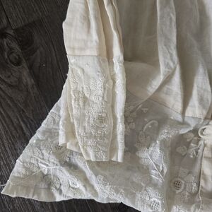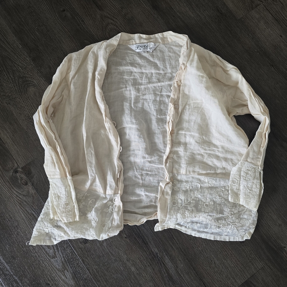 Lightweight cream cardigan with button-up front. Features delicate lace detailing on the sleeves and hem.