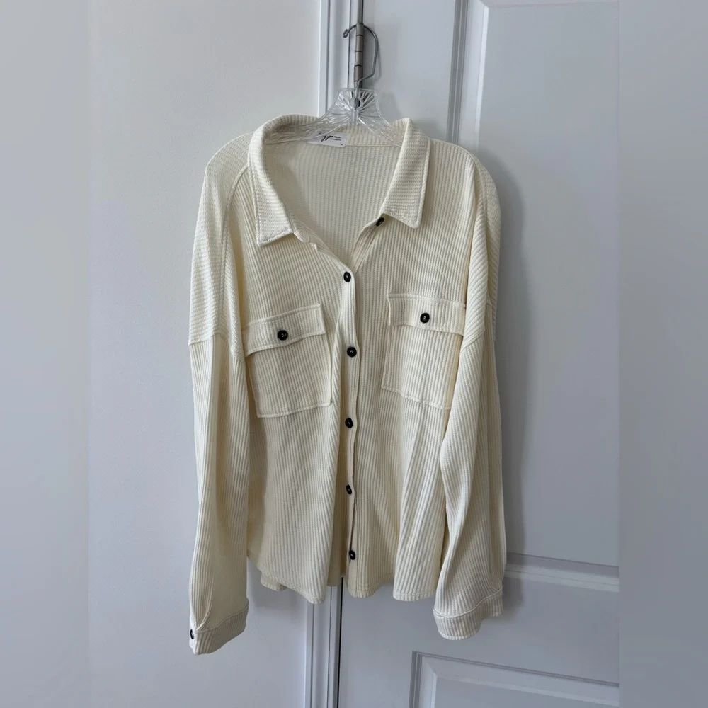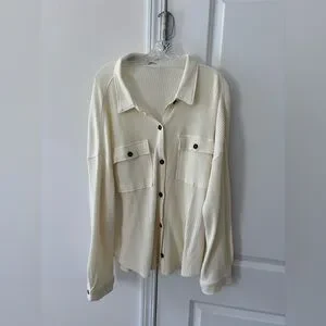 Stylish cream ribbed shirt/cardigan. Purchased from Carly Jean Los Angeles. Size Medium but fits more like a large. Hardly worn. It is truly so soft and comfy! I wish it fit me!