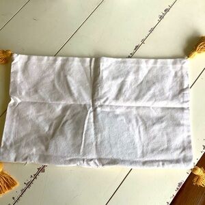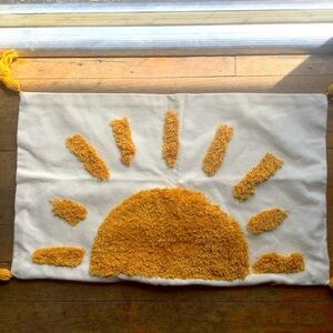 Canvas pillow cover with a hand hooked sunshine and tassels done in a ochre, mustard yellow cotton yarn.
