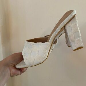 Unilook shoes, woven heels, checkerboard sandals, block heels, cream mules, square toe shoes, trendy sandals, neutral heels, fashion sandals, summer shoes, dressy sandals, size 8, gingham