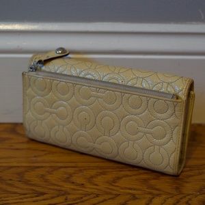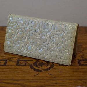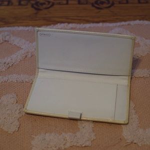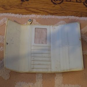 Well used, cream patent leather wallet. Small clutch sized, comes with matching check book (last 2 photos). Has 12 card slots, plus 4 that fit larger things (cash/checks), and a coin pocket on the outside.