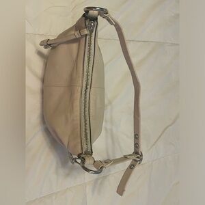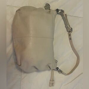 This small cream Coach bag is worth it for the bag charm alone! It is perfect for on the run when you just need a few things, with a lot of Y2K charm. It has a rare op art silver nickel metal hangtag charm. Preowned condition with a few small scuffs outside as pictured and a few small stains inside near the coach creed, which might come out if washed.