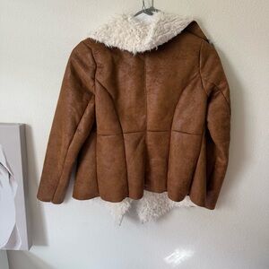 This teddy jacket features a rich brown body with a plush cream collar, offering a cozy and stylish look. The open front design adds a casual touch, making it perfect for layering on chilly days. Its hip-length cut ensures a flattering fit for any occasion.