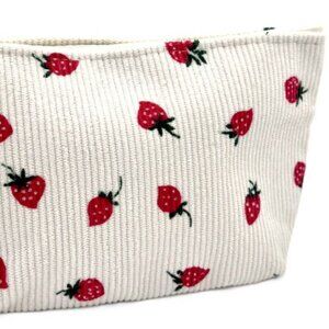 This versatile corduroy zippered pouch has a charming strawberry pattern on an off-white background. Whether you're looking for a stylish cosmetics pouch or a trendy accessory to carry your essentials, this bag has got you covered. Made with high-quality polyester corduroy, this pouch is not only very cute but also durable, ensuring that it will be your go-to accessory for years to come.