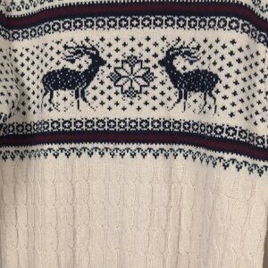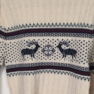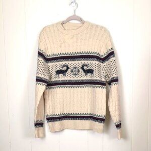 This cream/ beige crewneck knit sweater features a traditional Nordic Reindeer Design with a prominent horizontal band showcasing silhouettes of reindeer. The textured cable knit pattern adds visual interest, making it a cozy and stylish choice for colder days.