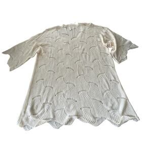 Lightweight cream crochet knit tunic dress in size 2XL. Semi-sheer open weave with scalloped hem and short sleeves, perfect layered over swimwear or slip dresses. Works as a summer beach cover-up , festival layer, or breezy coastal look.for all sizes. Soft and drapey polyester yarn gives it movement and texture. Great for coastal cottagecore, sea witchery, or boho-inspired styling. Laundering recommended upon receipt.